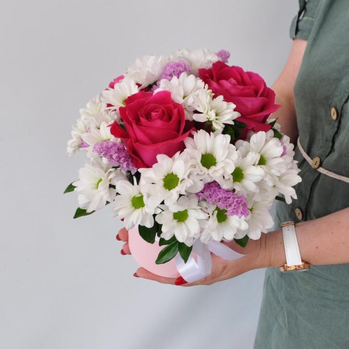 Хризантемы ромашки с розами в коробке «Мамина любовь»