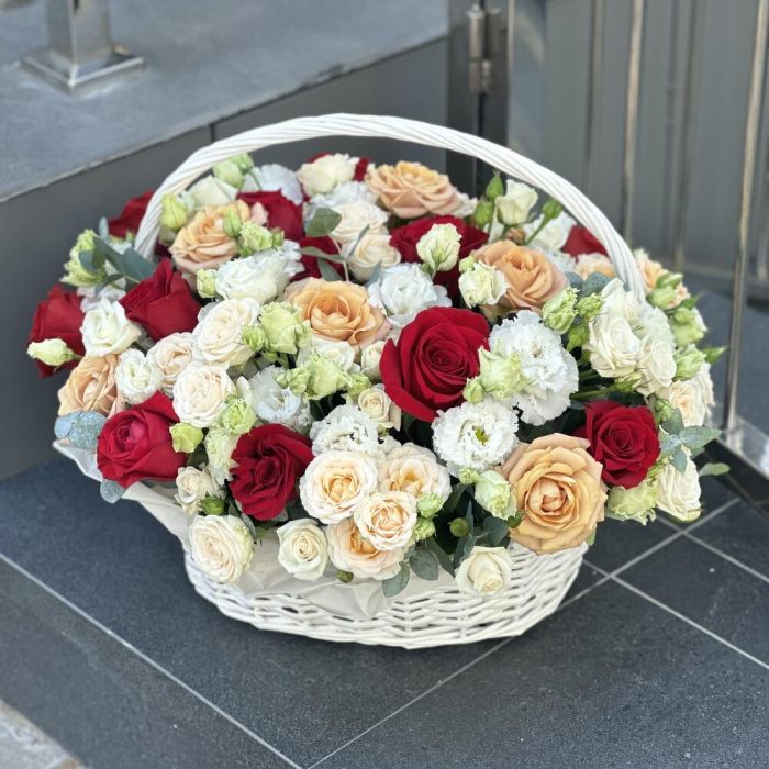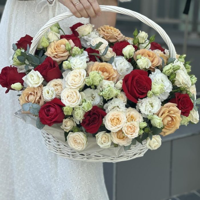 Корзина Прекрасная Иллюзия из роз сорта капучино, фридом, эустомы и кустовых роз
