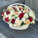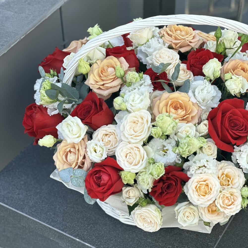 Корзина – 1 шт. Роза красная – 13 шт. Эвкалипт – 3 шт. Кустовая роза – 12 шт. Эустома – 4 шт. Оазис – 4 шт. Оформление – 1 шт. Роза сорта капучино – 9 шт.