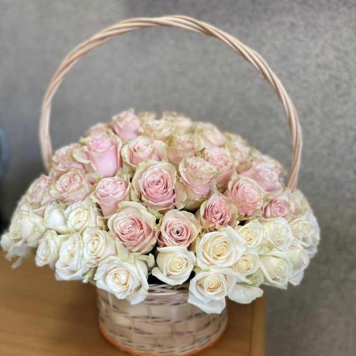 Роза Эквадор – 99 шт.Лента атласная – 2 шт.Корзина плетеная – 1 шт.Упаковка дизайнерская – 2 шт.