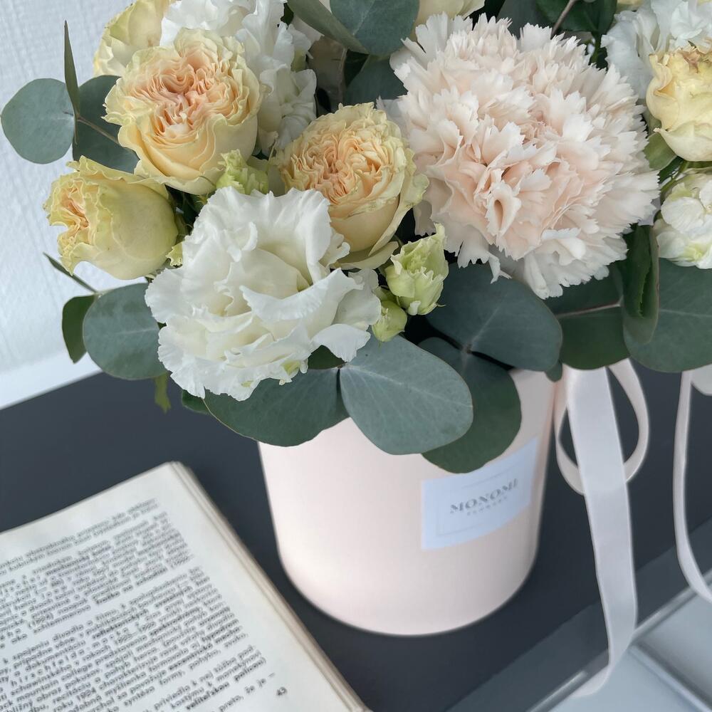 Роза садовая кустовая – 2 шт.Диантус – 3 шт.Эустома – 2 шт.Эвкалипт – 3 шт.Оазис флористический – 1 шт.Шляпная коробка – 1 шт.Лента атласная – 1 шт.наклейка фирменная – 1 шт.