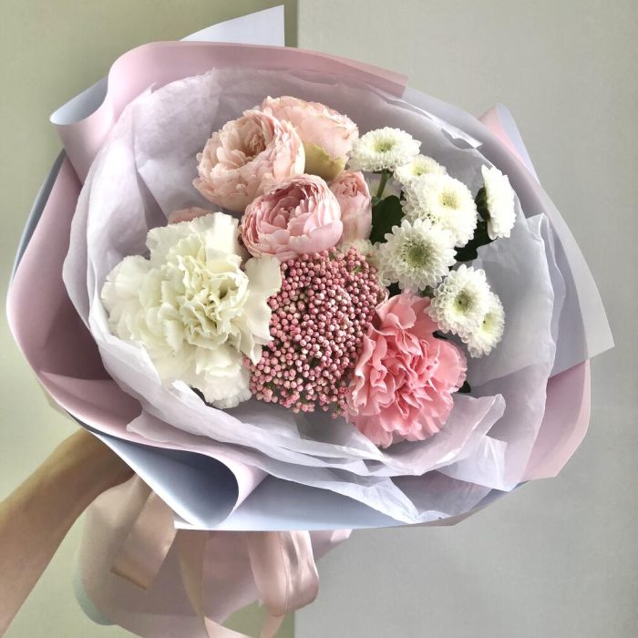 Гвоздики, Лизиантусы, Розы, Тюльпаны