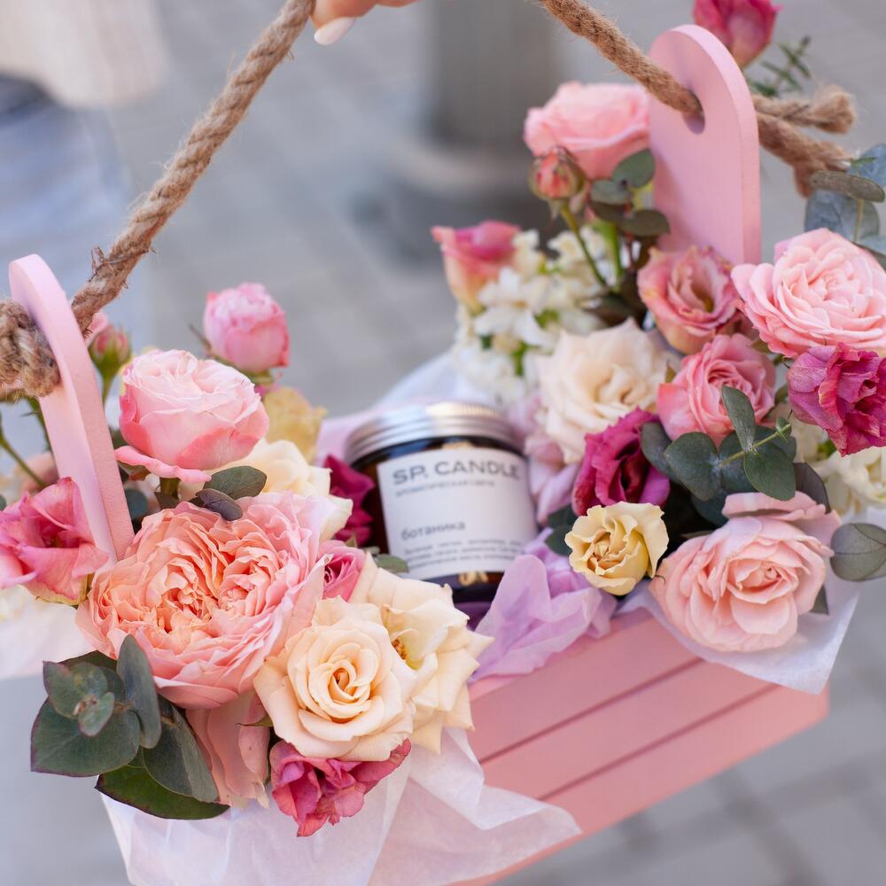 Нежная цветочная композиция в ящике с ароматической свечой