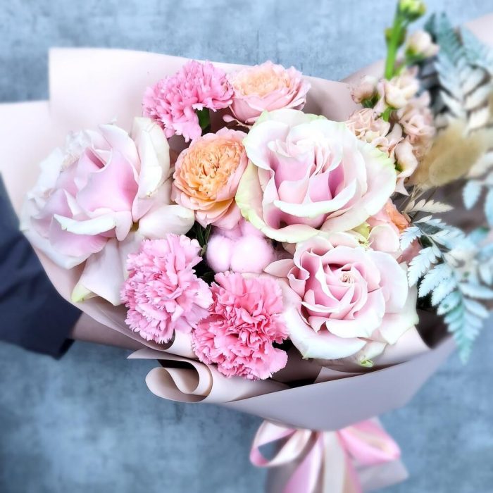 Маттиола – 1 шт.Папоротник – 1 шт.Хлопок – 1 шт.Роза Эквадор – 3 шт.Гвоздика – 3 шт.роза джульетта кустовая – 1 шт.