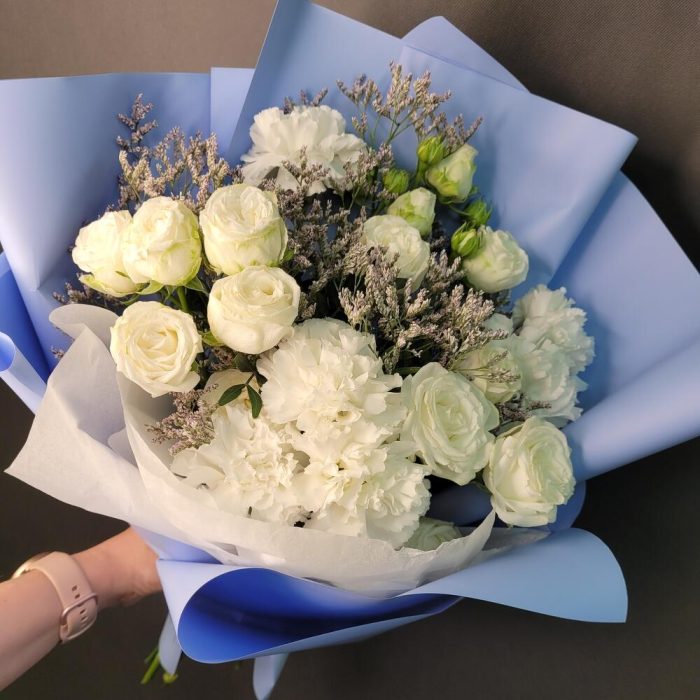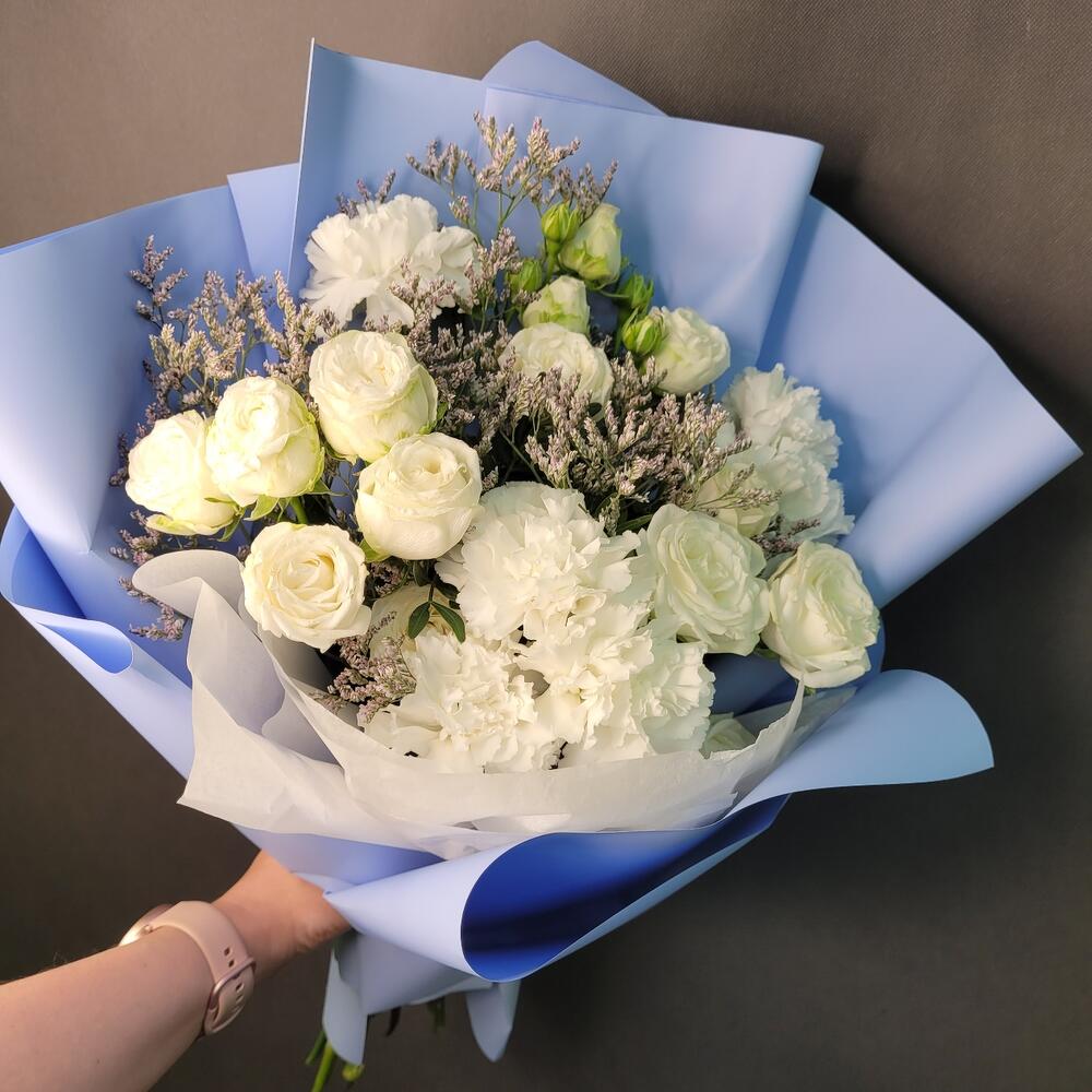 Кустовая роза – 3 шт.Диантус – 6 шт.Лимониум – 2 шт.Фисташка – 2 шт.Упаковка дизайнерская – 1 шт.Лента атласная – 1 шт.