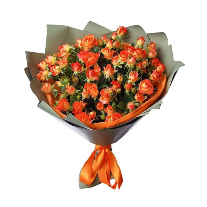 оранжевые кустовые розы – 13 шт. Открыточка с вашими пожеланиями – 1 шт. Упаковка дизайнерская – 3 шт.
