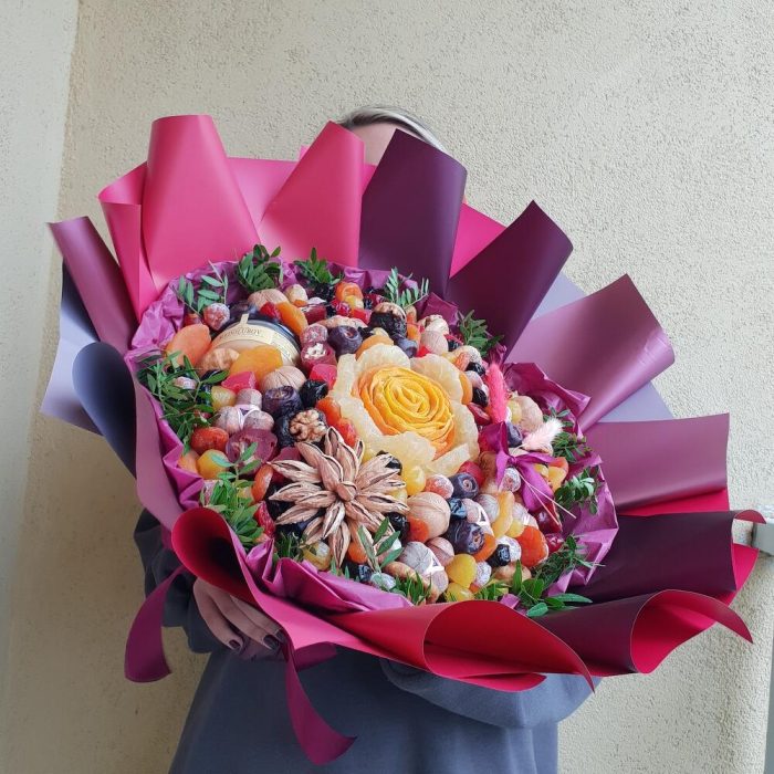 Премиальный букет из сухофруктов , орехов и крем меда. У ваших друзей намечается юбилей или значимое торжество , хотите удививить и впечатлить – эта модель букета то, что нужно для получения восторгов , улыбок и слов удивления !!!Букет упаковывывается в пленку слюду … Показать ещёи доставляется в транспортировочной коробке.