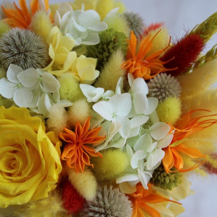 Гортензия – 1 шт.Роза – 1 шт.Колосья – 1 шт.Лагурус – 1 шт.Фаларис – 1 шт.Мордовник – 1 шт.Сетария – 1 шт.Керамическое кашпо – 1 шт.