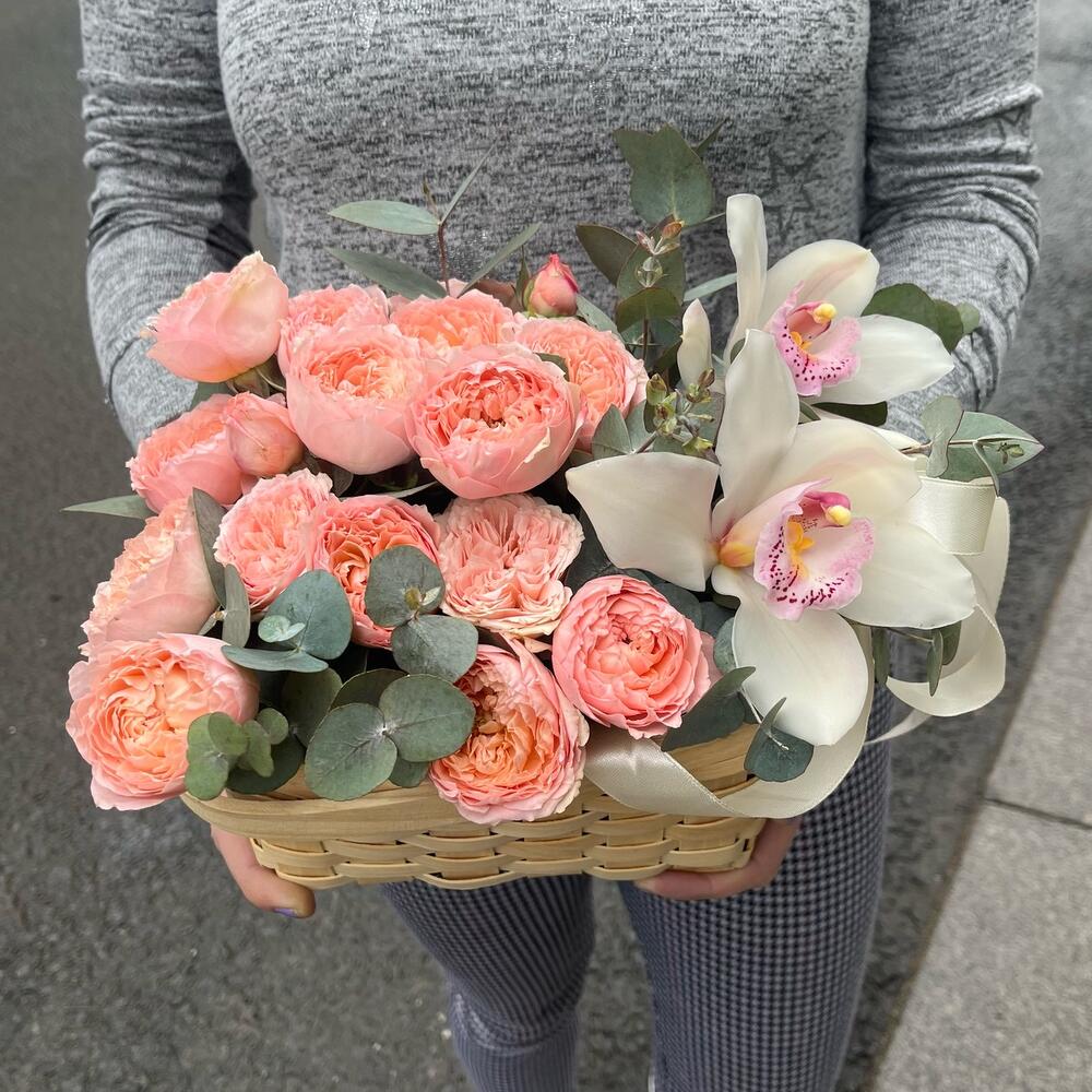 роза премиум пионовидные джульетта нежно-розовая – 4 шт.Эвкалипт – 3 шт.удлинитель для орхидеи – 2 шт.Орхидея Цимбидиум белая – 2 шт.Корзина плетеная – 1 шт.Оазис флористический – 1 шт.Лента атласная – 1 шт.