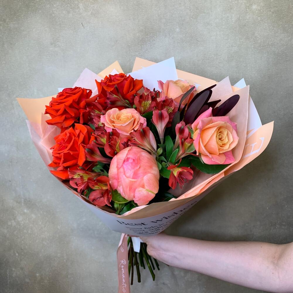 Роза французская – 3 шт.Роза – 3 шт.Альстромерия – 3 шт.Сафари – 1 шт.Пион – 1 шт.Упаковка – 2 шт.