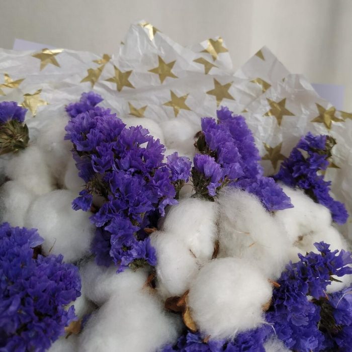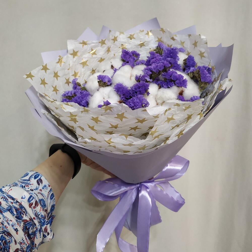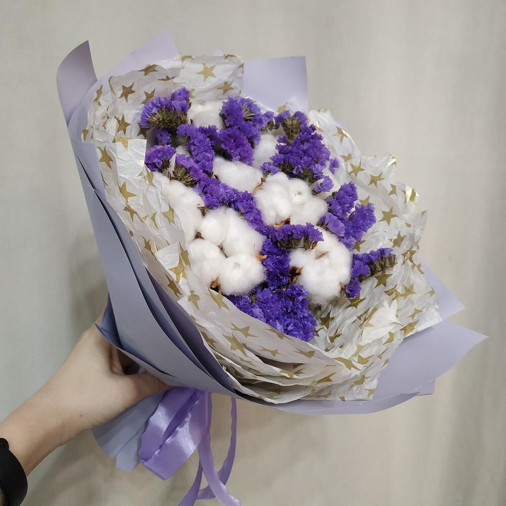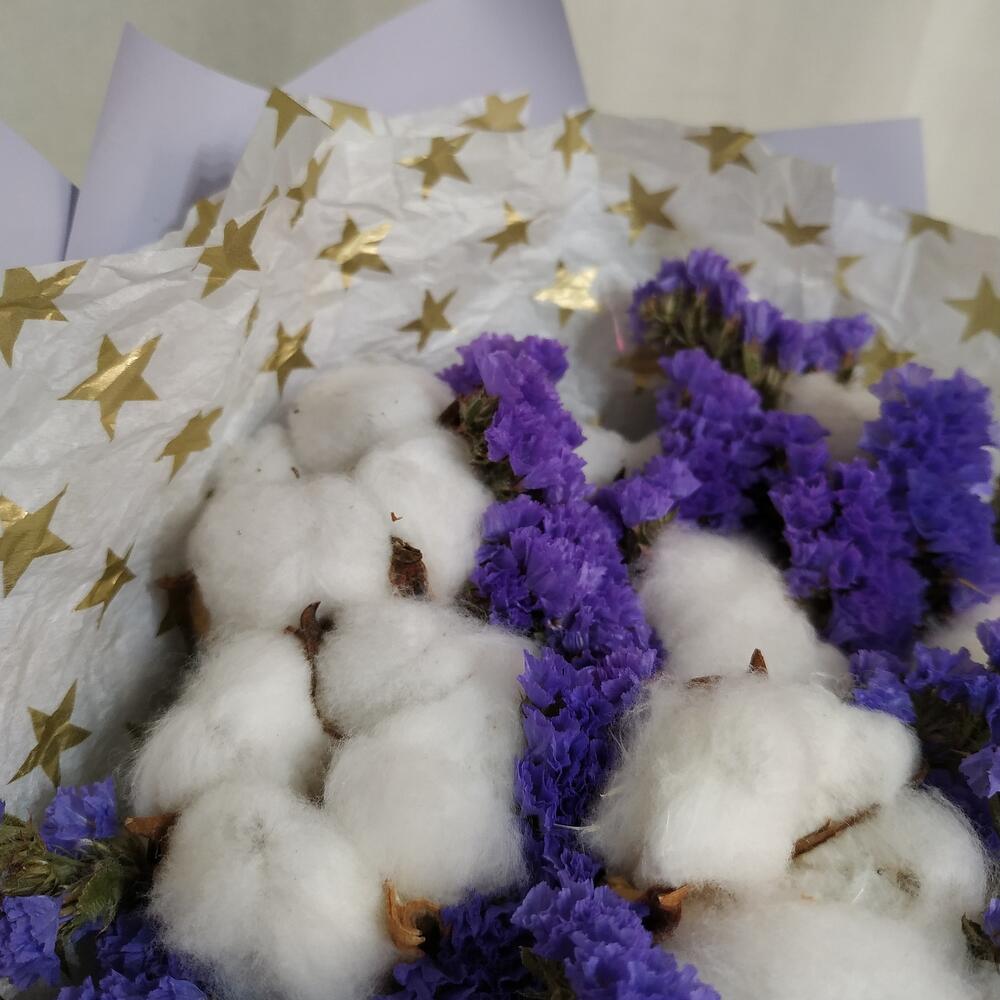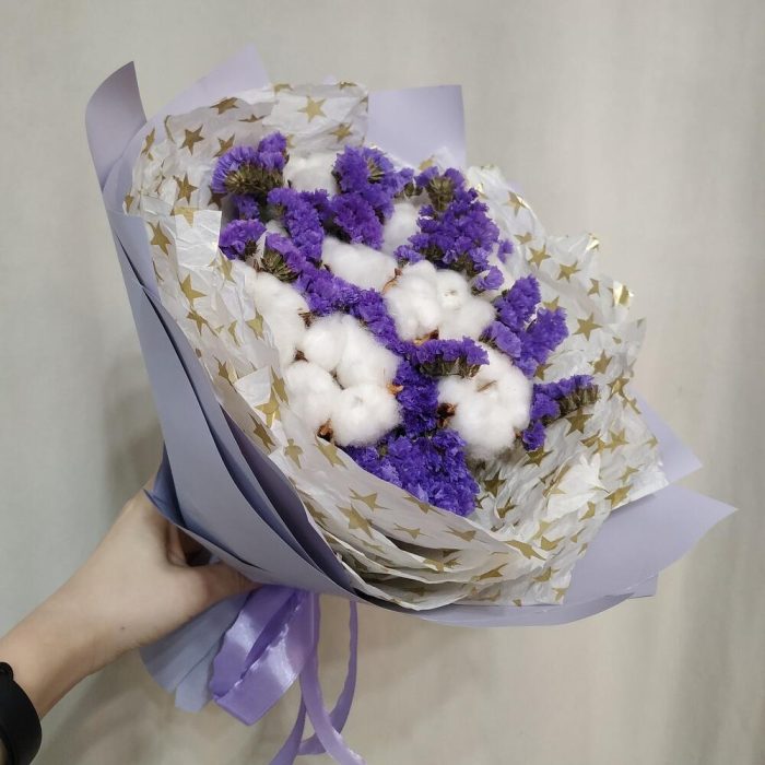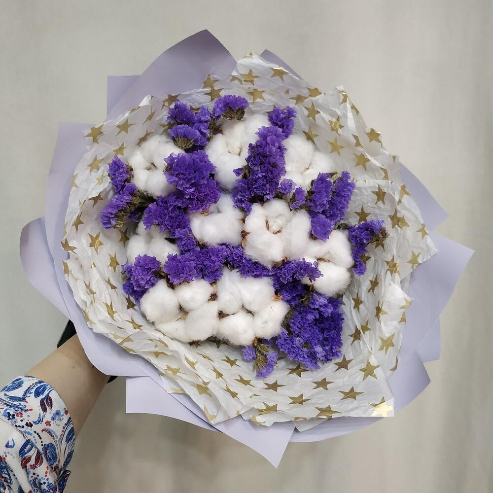 «Лавандовое созвездие» Букет из розы, гвоздики, статица и хлопка