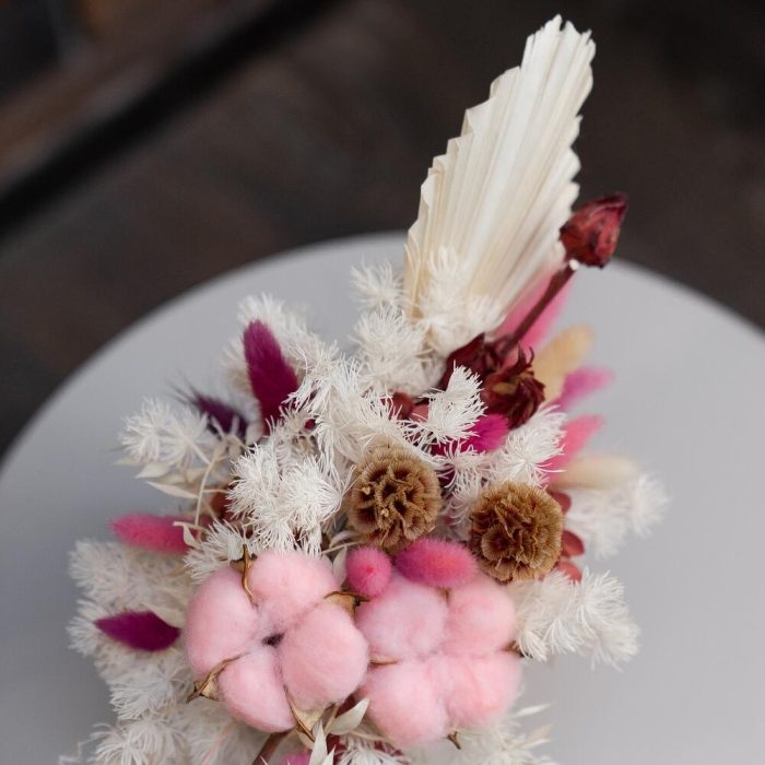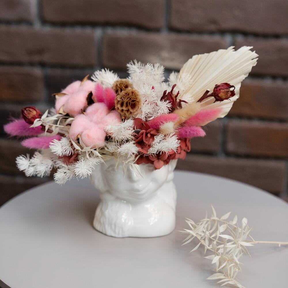 Хлопок натуральный – 2 шт.Скабиоза – 3 шт.Лагурус (сухоцвет) – 15 шт.аспарагус стабилизированный – 4 шт.гортензия стабилизированная – 1 шт.пальма сухоцвет – 1 шт.Кашпо керамическое – 1 шт.