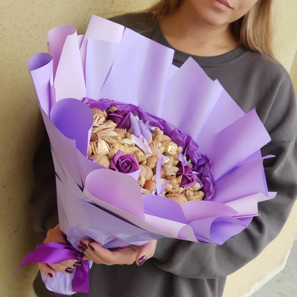 мыльные розы – 3 шт.Грецкий орех – 115 гр.Фундук – 25 гр.Фисташки – 18 гр.макадамия – 20 гр.Миндаль – 40 гр.конфета роше – 1 шт.пекан – 16 гр.арахис в скорлупе – 65 шт.Лагурус – 2 шт.дополнительный декор – 5 шт.