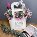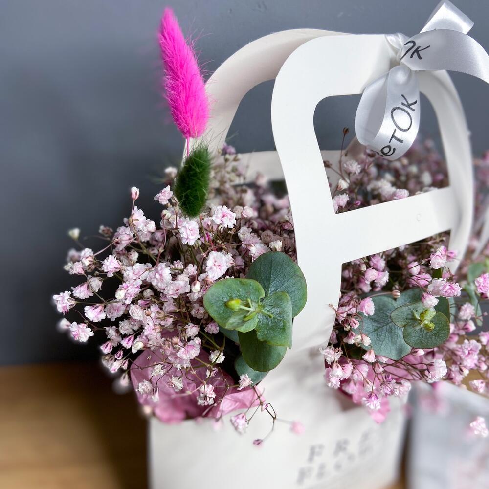 Гипсофила розовая – 4 шт.Эвкалипт ценерия – 3 шт.Лагурус (сухоцвет) – 2 шт.плайм сумка – 1 шт.