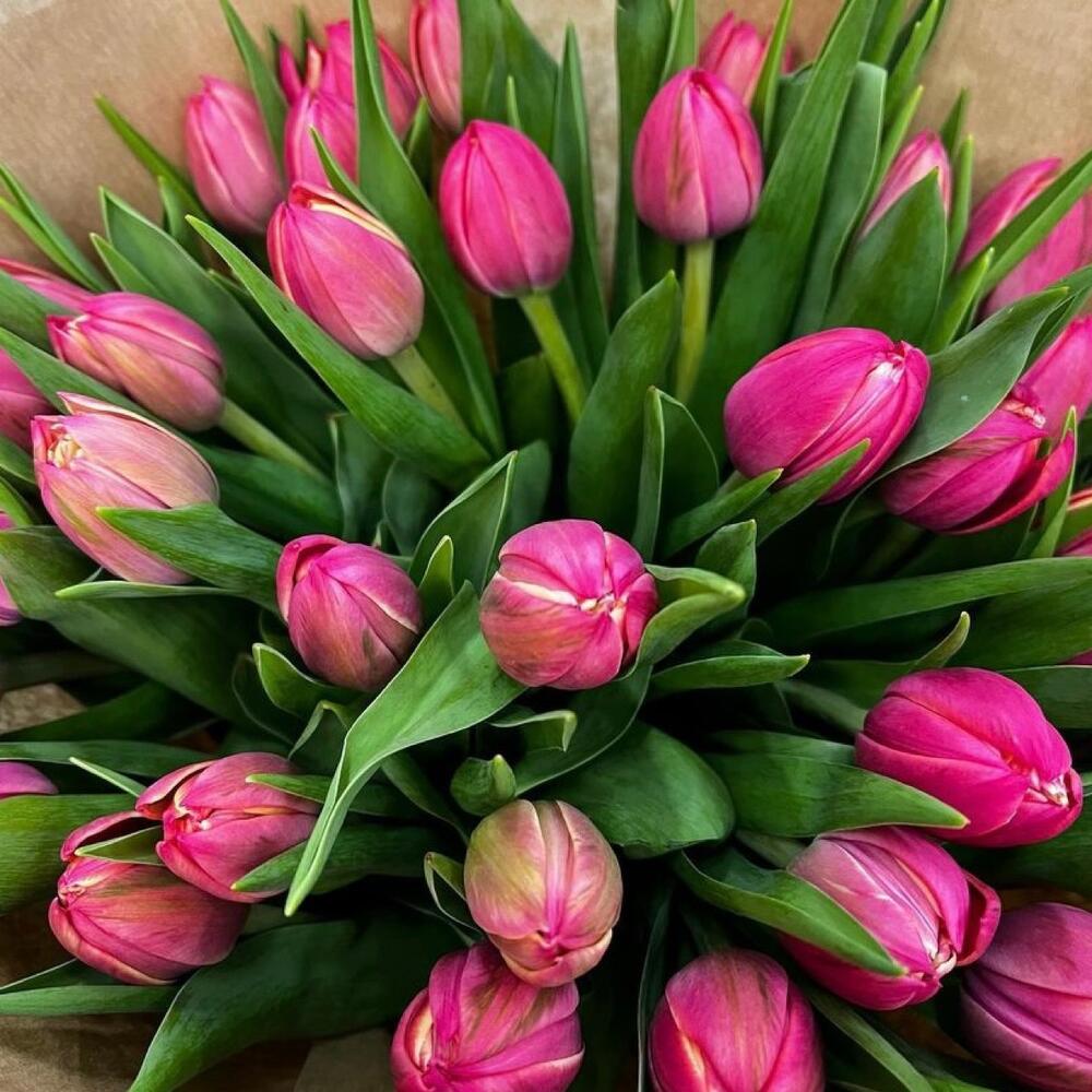 Лента атласная – 2 шт.Тюльпан пионовидный – 35 шт.Упаковка дизайнерская – 2 шт.
