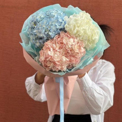 Букет из гортензии, пионовидной розы, эустомы, диантуса, кустовой розы и альстромерии “Летняя нежность”