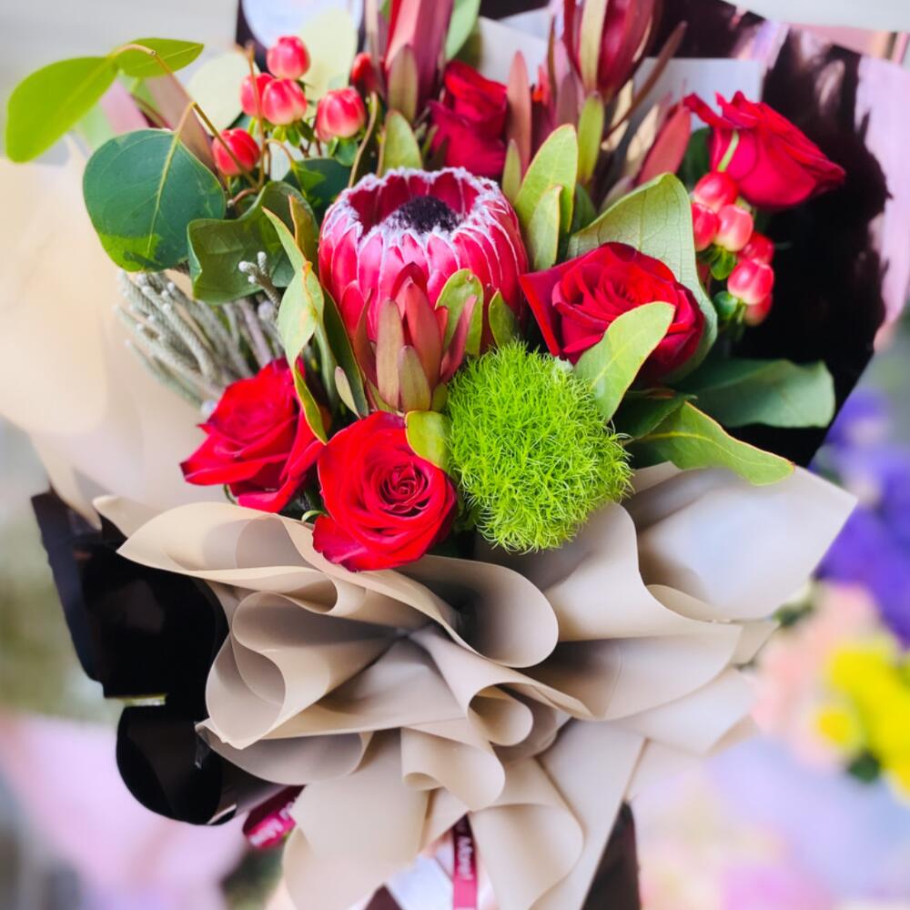 Протея – 1 шт. грін тік – 1 шт. хіперикум – 2 шт. брунія – 2 шт. леукадетрон – 2 шт. червона троянда – 3 шт. евкаліпт – 1 шт.
