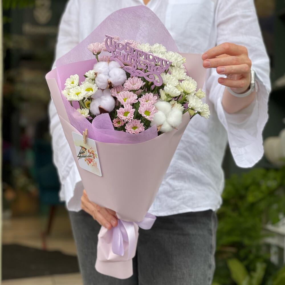 Хлопок – 3 шт.Хризантема Сантини – 5 шт.Упаковка – 1 шт.Лента атласная – 1 шт.Топпер деревянный – 1 шт.Мини открытка – 1 шт.