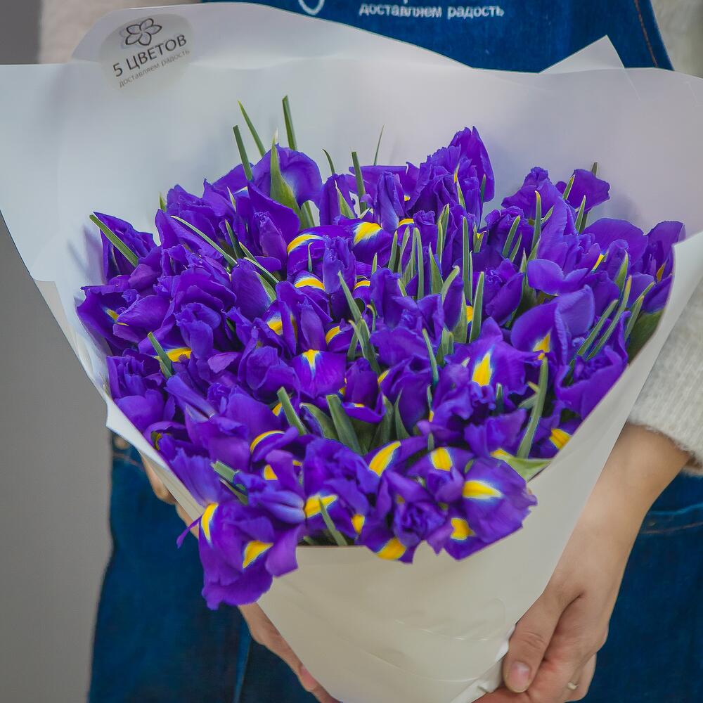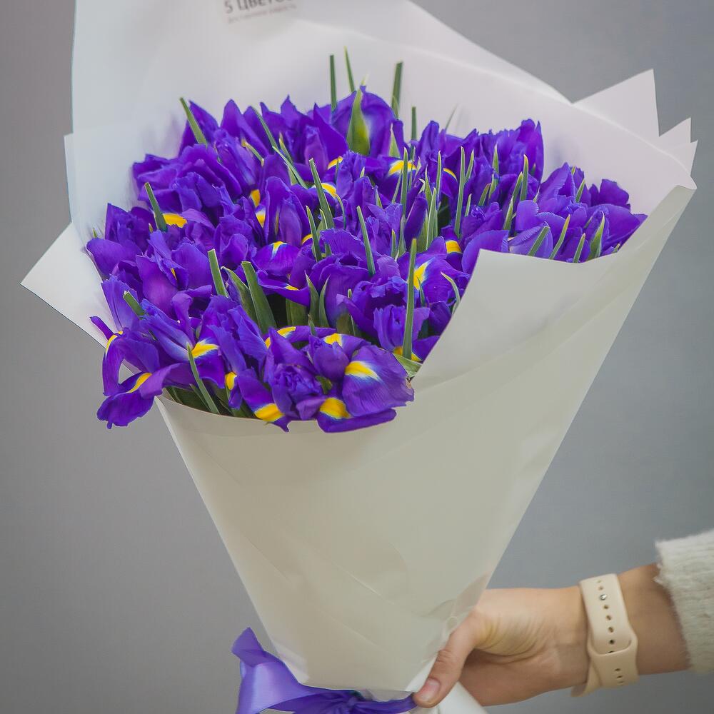 ирисы синие – 51 шт.Упаковка матовая – 1 шт.Лента атласная – 1 шт.