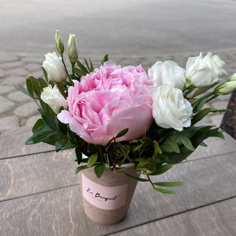 Лизиантус – 1 шт.Пион – 1 шт.Фисташка – 1 шт.Оазис флористический – 1 шт.Стакан крафт дизайнерский – 1 шт.