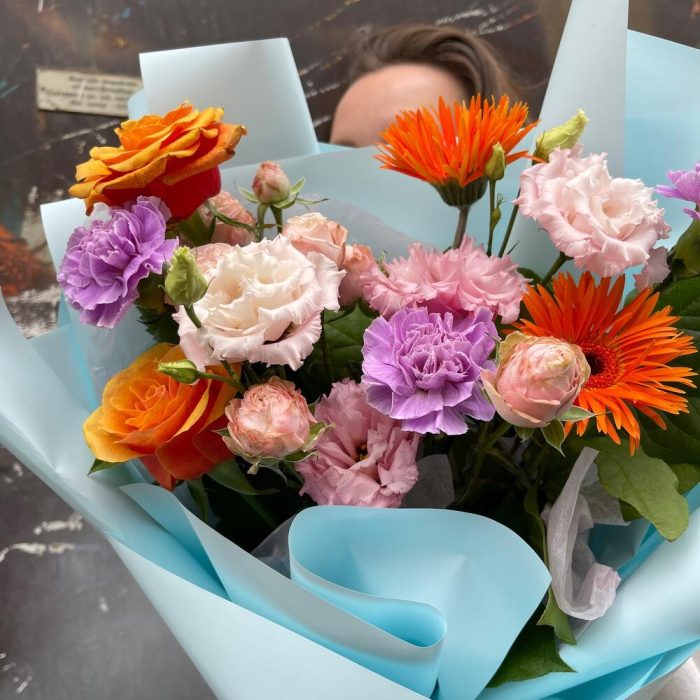 гербера мохровая – 2 шт.Диантус – 3 шт.Салал – 2 шт.Роза оранжевая – 2 шт.Роза пионовидная кустовая – 1 шт.Лизиантус – 1 шт.Упаковка дизайнерская – 3 шт.