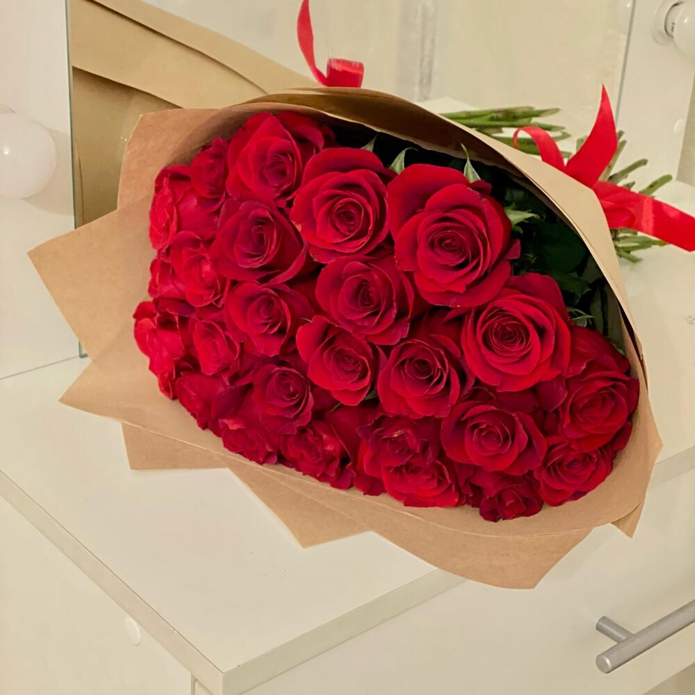 Лента атласная – 1 шт.Крафт упаковка – 4 шт.красная эквадор роза 50 см – 25 шт.