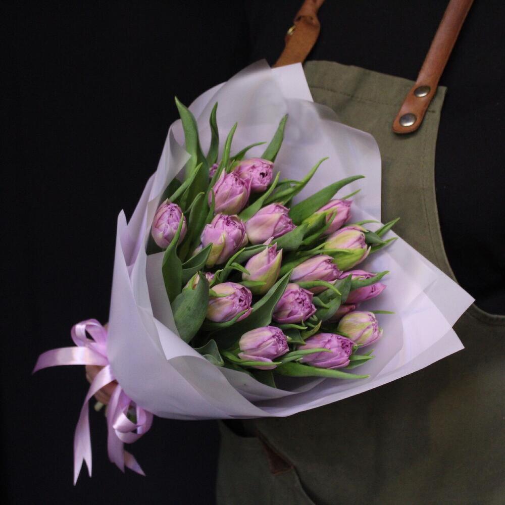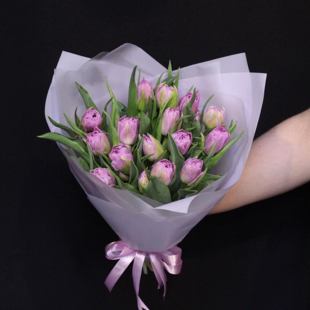 Лента атласная – 1 шт.Тюльпан пионовидный дабл прайс – 15 шт.Пленка дизайнерская – 4 шт.